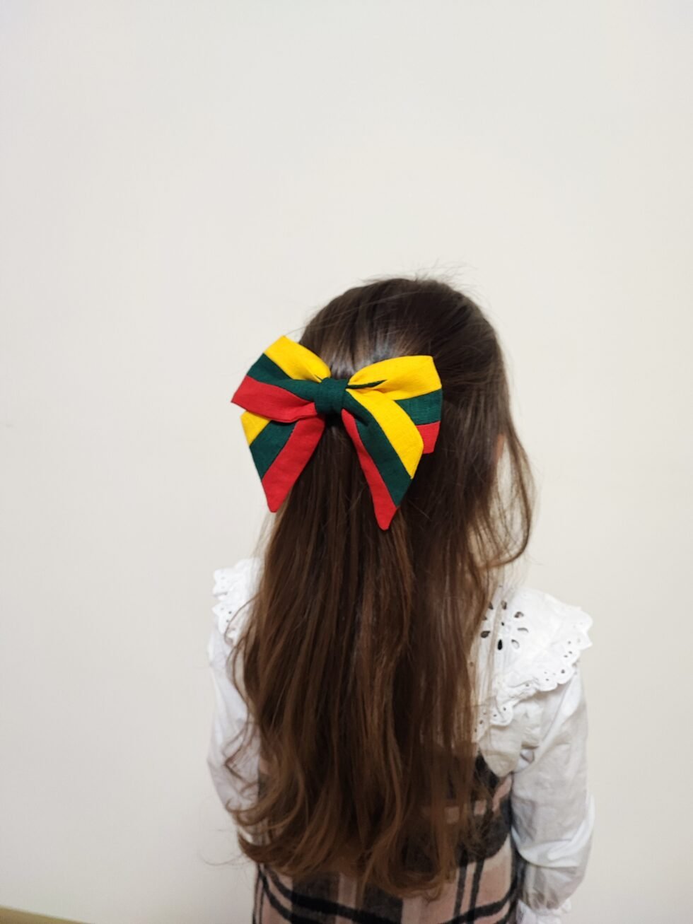 Lininis plaukų kaspinas su Lietuvos trispalvės motyvais – stilinga pagarba tradicijoms.